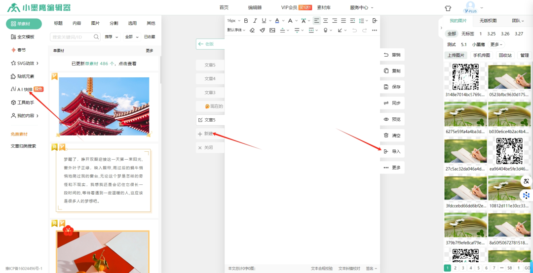 2、新建文章或导入文档:可以点击 “新建” 按钮开始创作,也可以选择 点击编辑区右侧的“导入”按钮,或者左侧的“AI 快排”-“导入 - AI 快排” 上传已经在 Word 等文档中写好的文章内容。