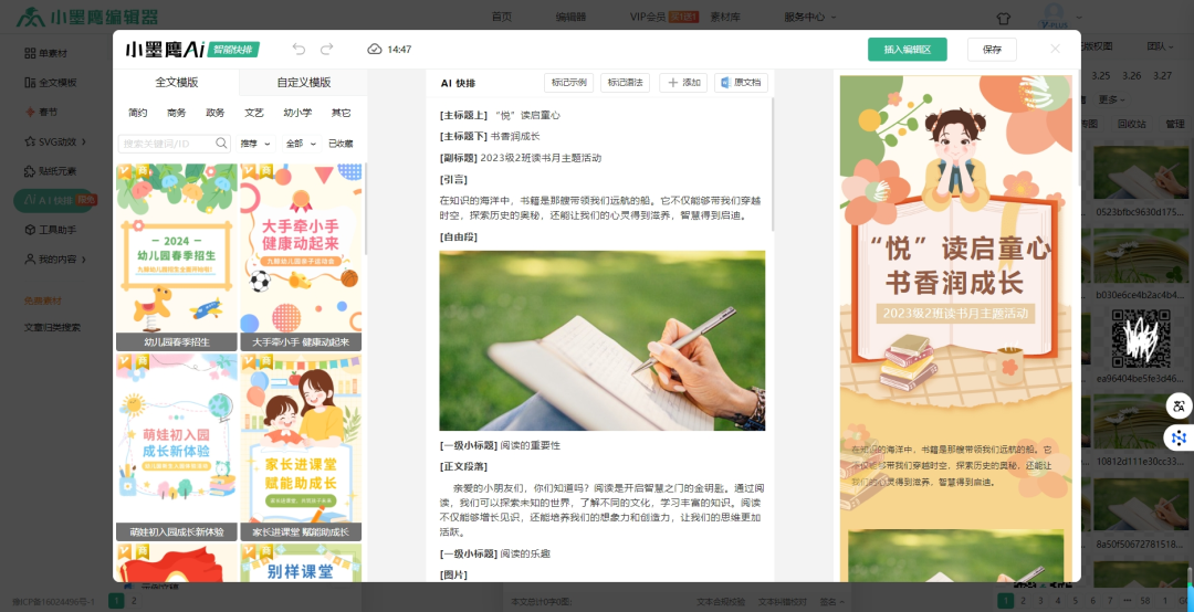 3、AI 快排排版:上传完成跳转排版页,系统会给出推荐排版,若不喜欢,点击左上角 “返回”。也可按分类或关键词搜索模板,点击 “预览” 查看效果,满意后点击 “一键排版”,再点击 “插入编辑区”,完成排版。