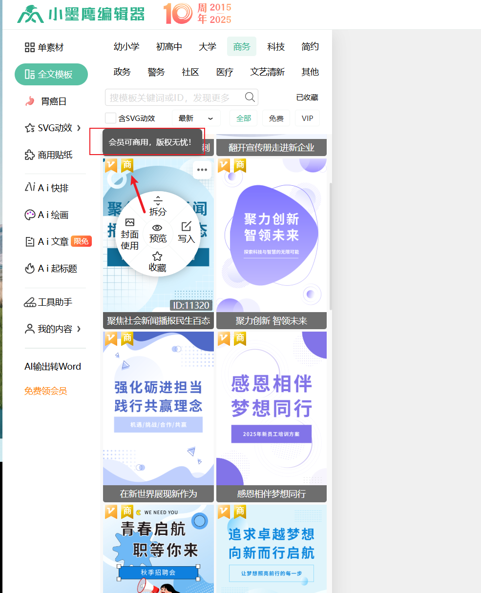 模板/素材: 选择提供明确商用授权的第三方排版工具(小墨鹰编辑器)或平台,这类专业工具模板素材都很丰富,各种风格的,收费一般也不贵,比侵权比少的多。