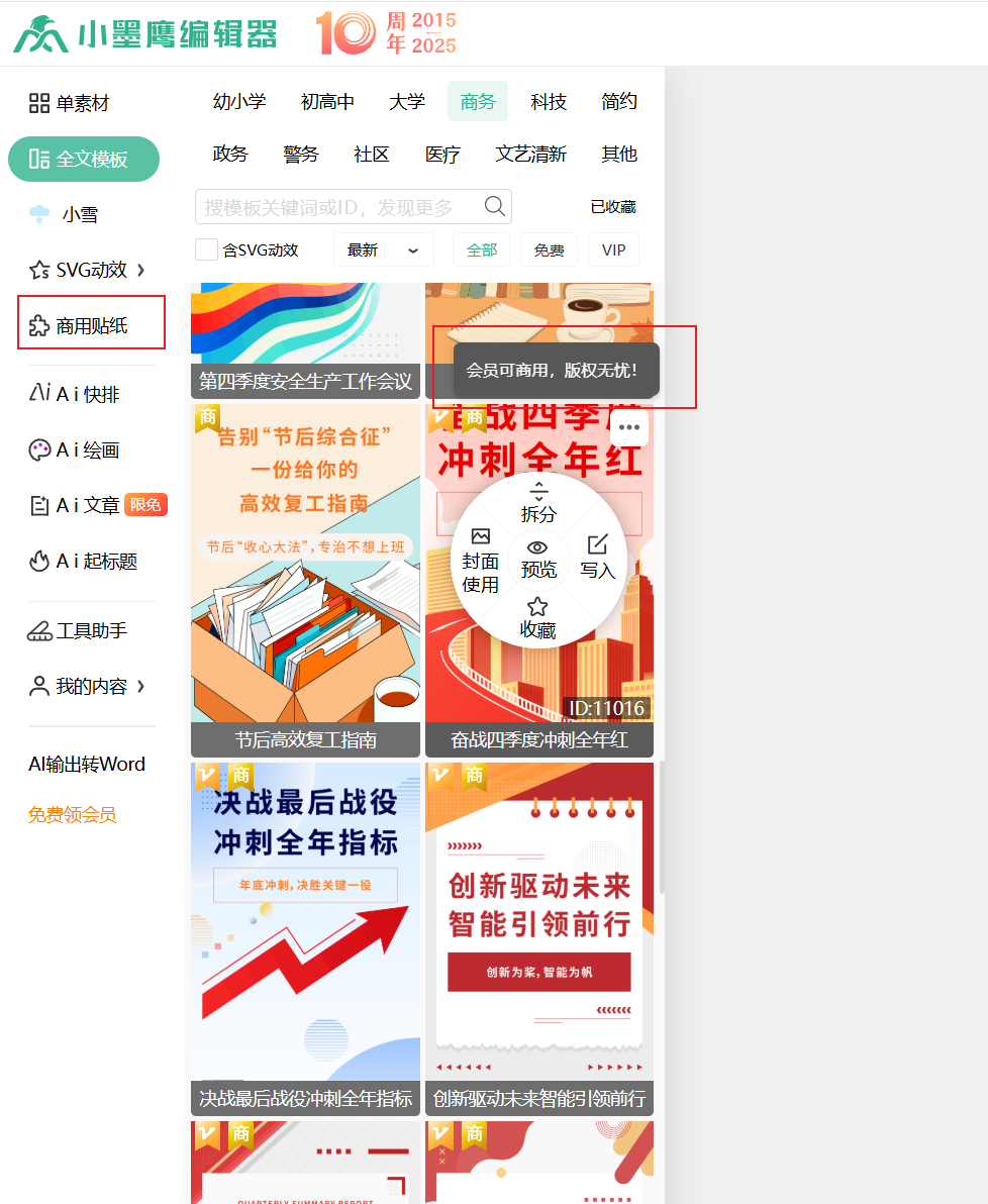 公众号排版使用样式图片,要注意选择正版可商用的平台,推荐使用小墨鹰编辑器,模板素材都有商用标志,字体正版授权,大平台用户体量大,无需担心版权风险。