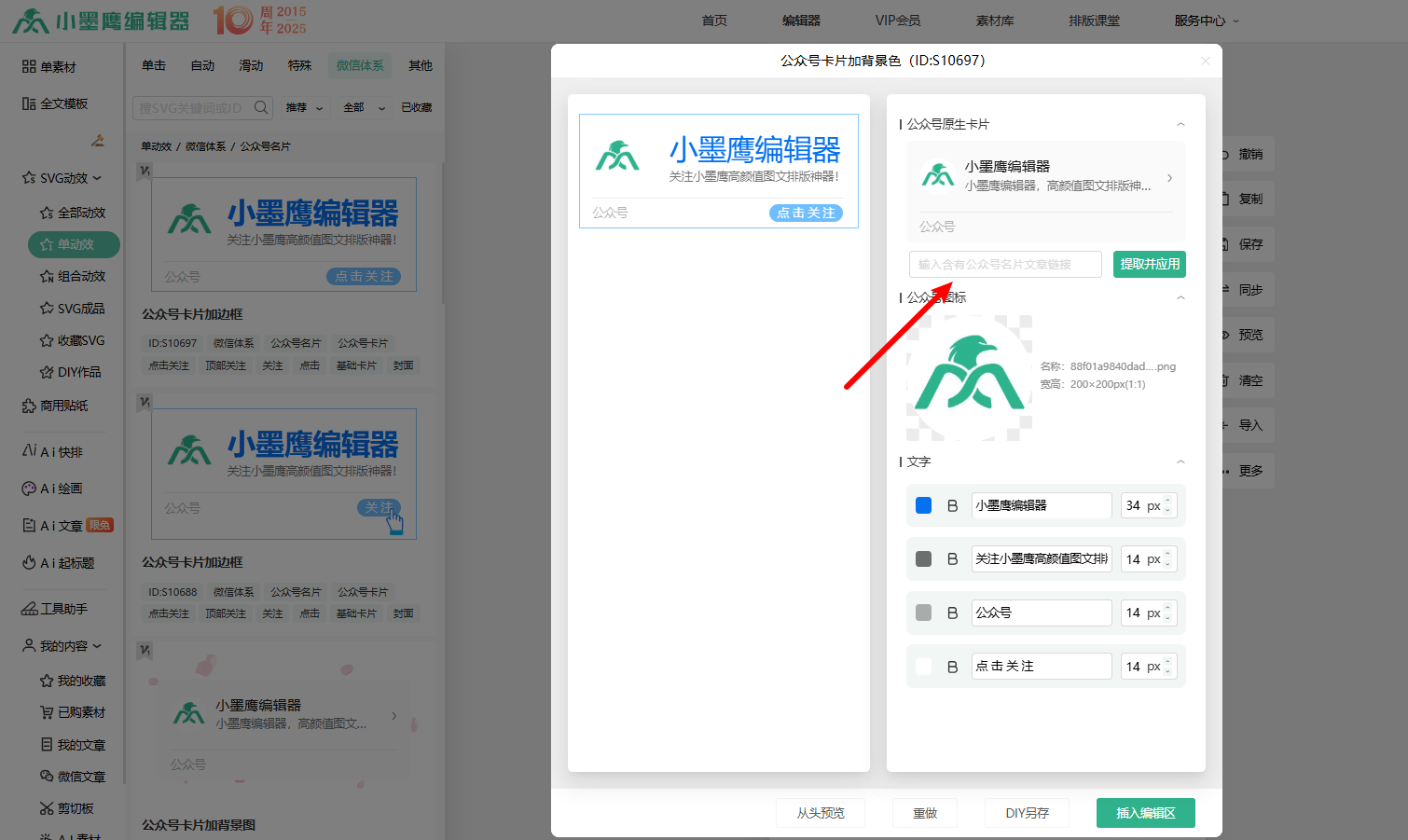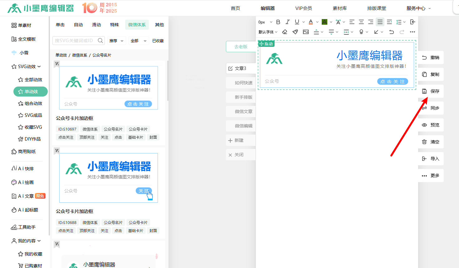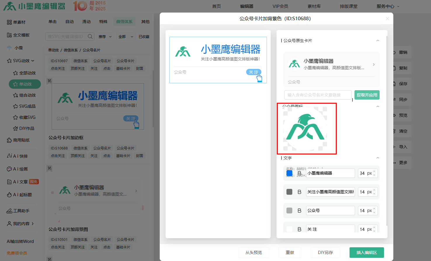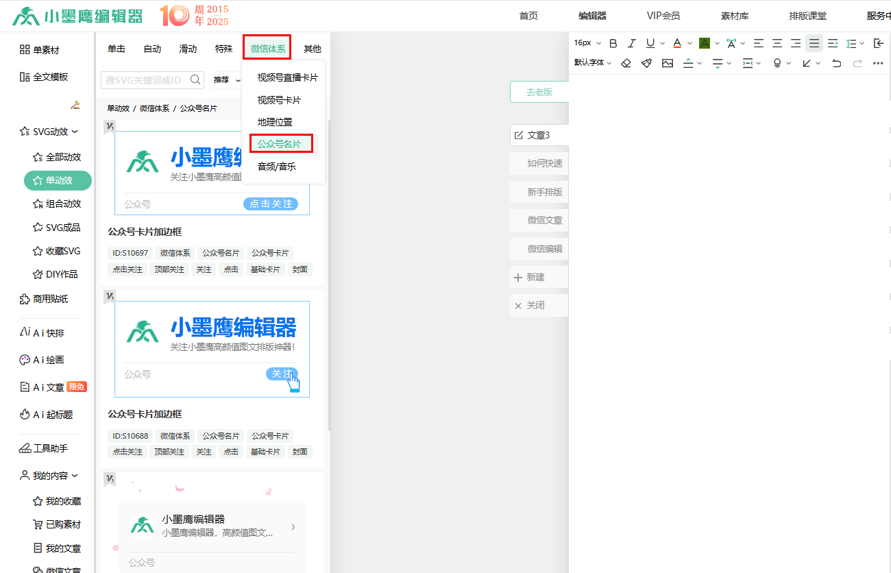 使用时,先在小墨鹰编辑器左侧依次点击“SVG动效 - 单动效- 微信体系 -公众号名片”,然后挑选一个自己心仪的样式写入编辑区。