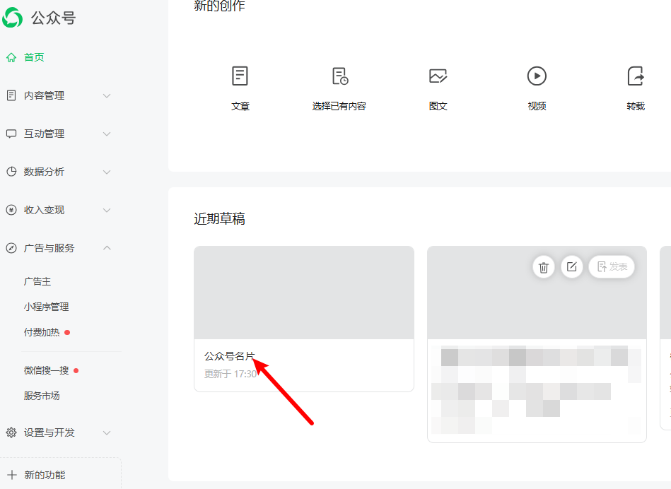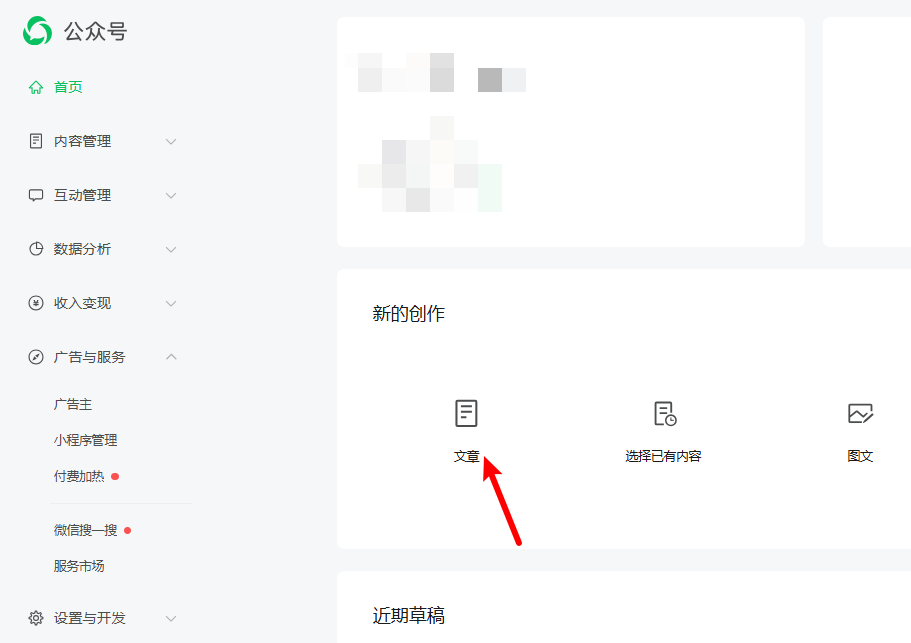 接下来要去微信公众平台提取含公众号名片的链接,步骤很简单:打开微信公众号后台,新建一篇文章;