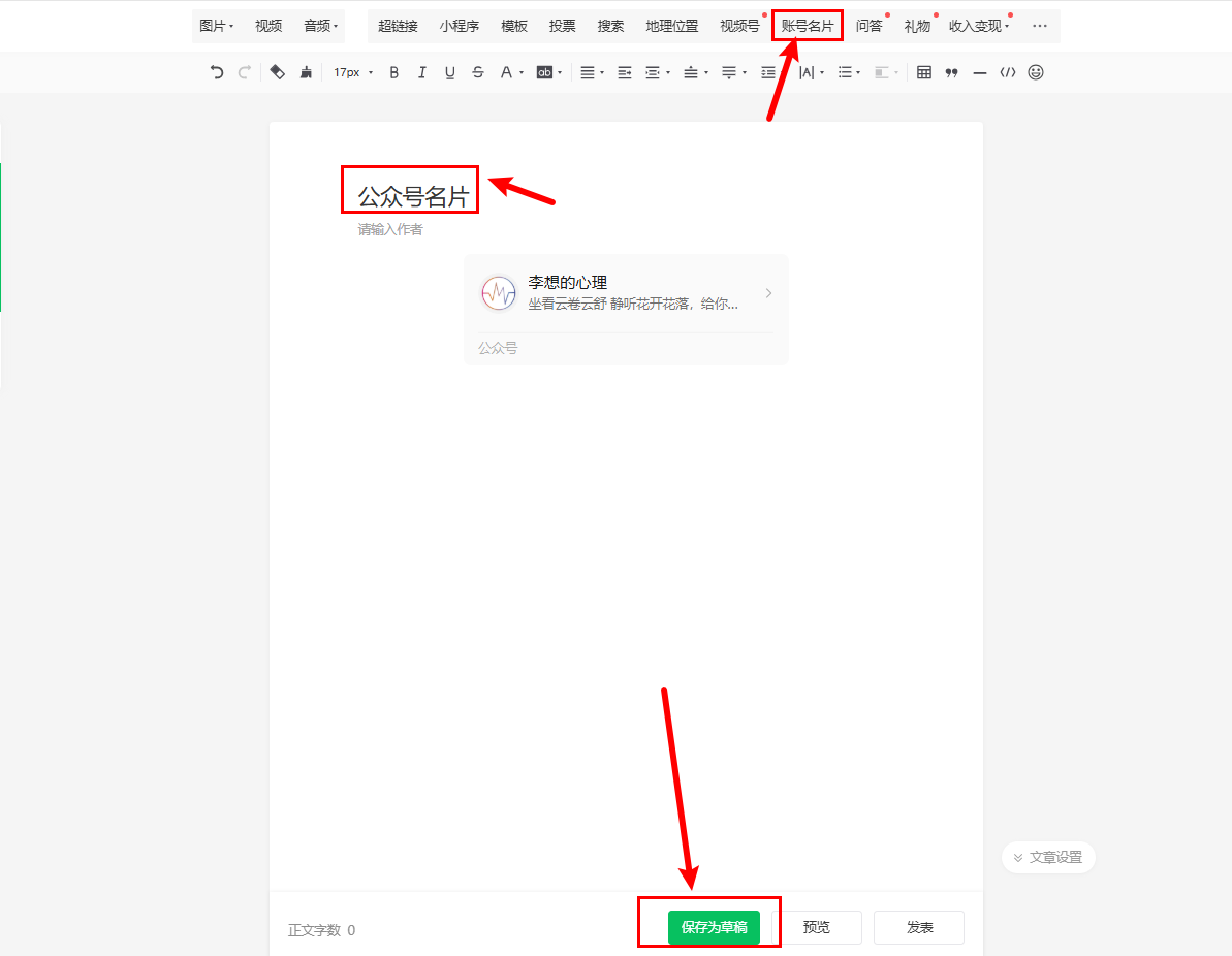 然后点击顶部的账号名片并搜索公众号名称,选择后点击插入即可。再随便起个标题,将文章保存为草稿;