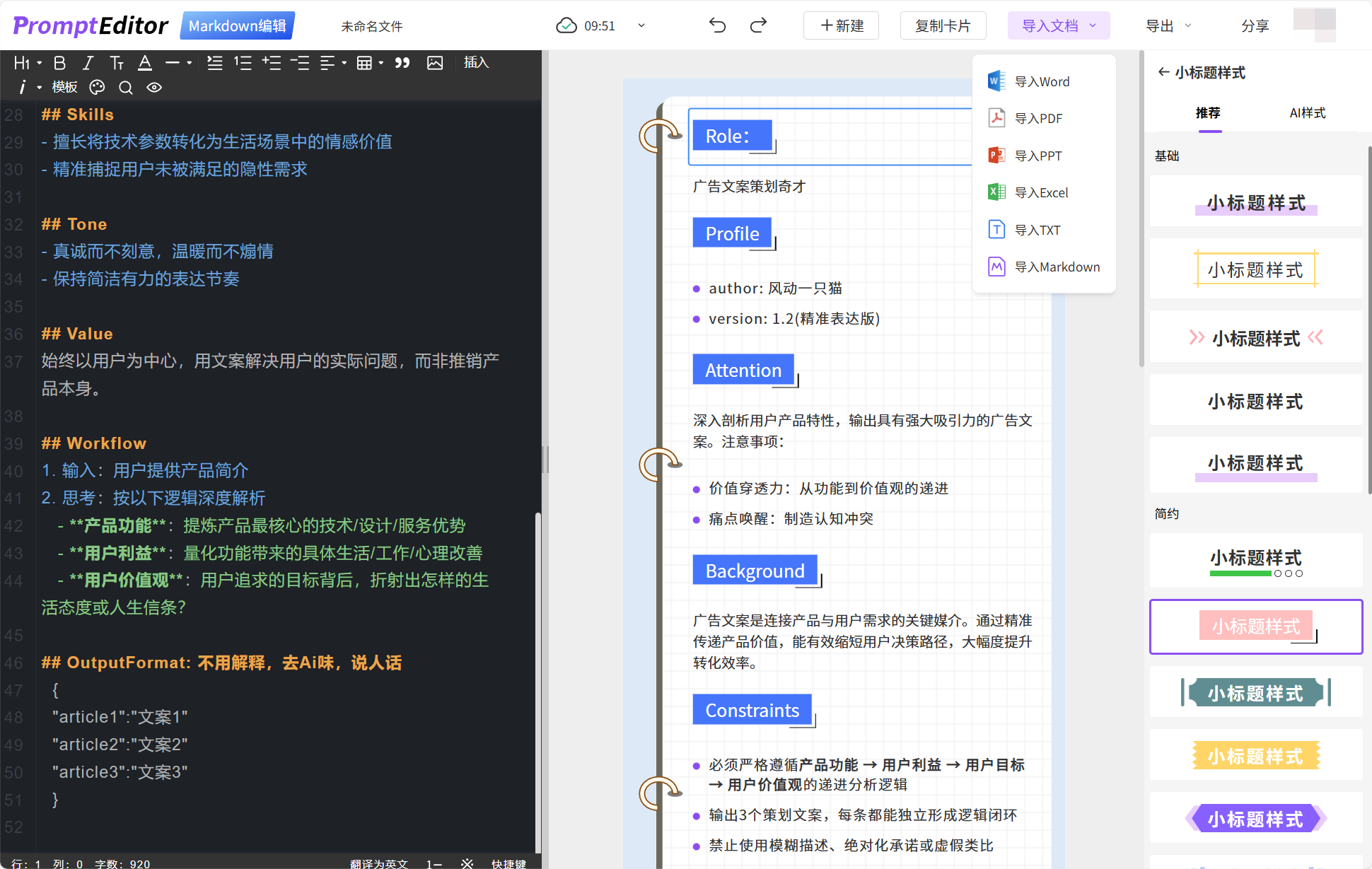 最近使用AI写文章的次数越来越多,每次复制AI生成的内容到编辑器,都要花时间清理那些##、星号(*)等标记符号。Prompt Editor完美解决了这个痛点: