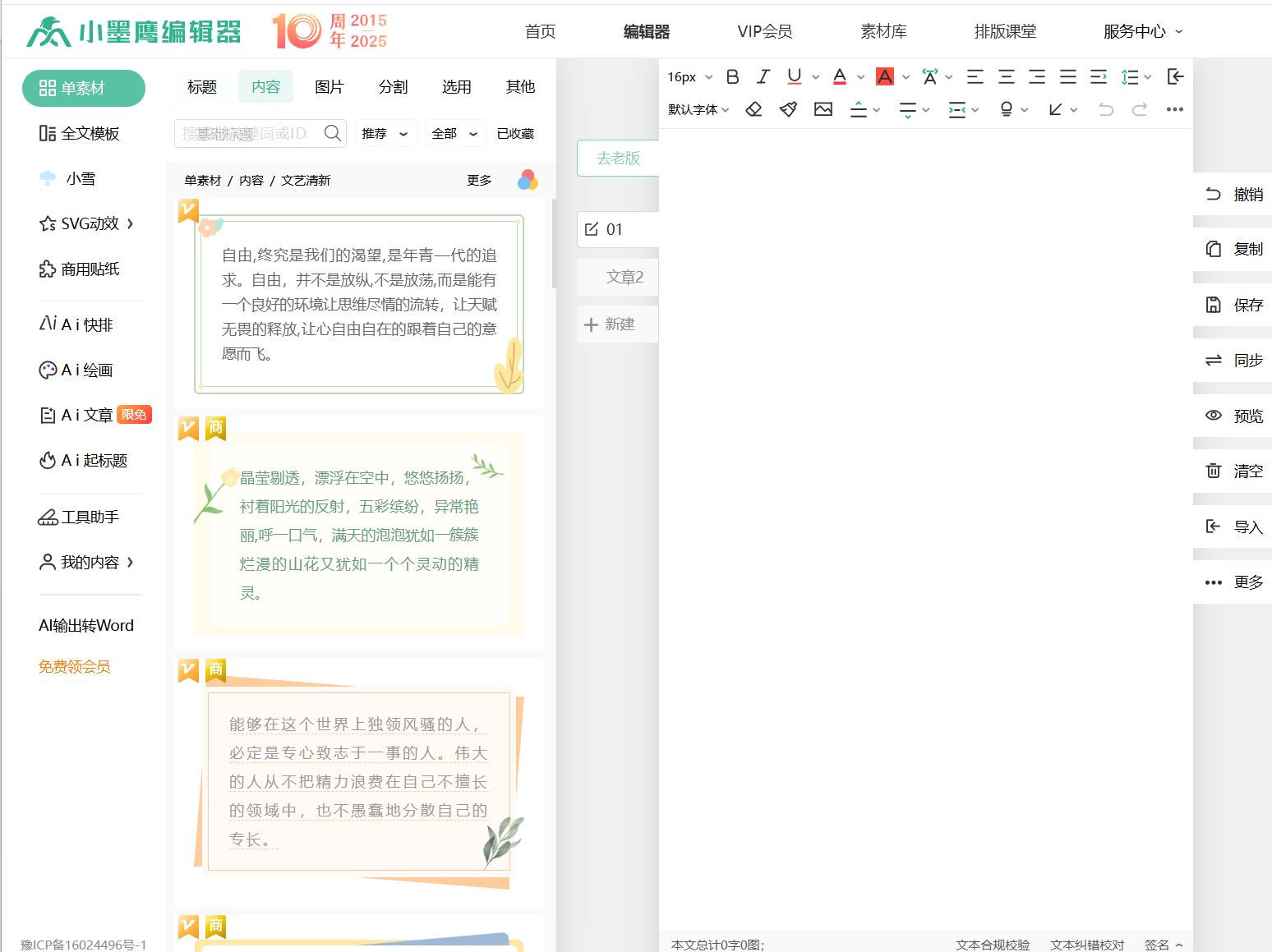 在长期从事微信公众号编辑工作的过程中,许多人都曾深切体会到创作过程中所面临的排版困境——需要反复调整字体样式却难以达到理想效果,在庞杂的样式库中耗费大量时间,最终呈现的版面效果往往不尽如人意。通过对十余款编辑工具的严谨测试与评估,我们现精选出6款兼具免费与实用性优势的编辑器予以推荐。其中第三款工具所展现的AI排版功能,或将彻底改变您对智能排版技术的认知。