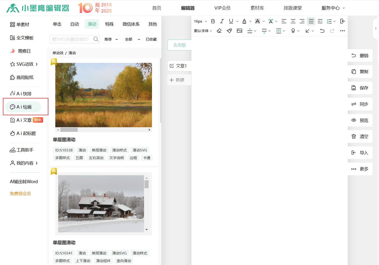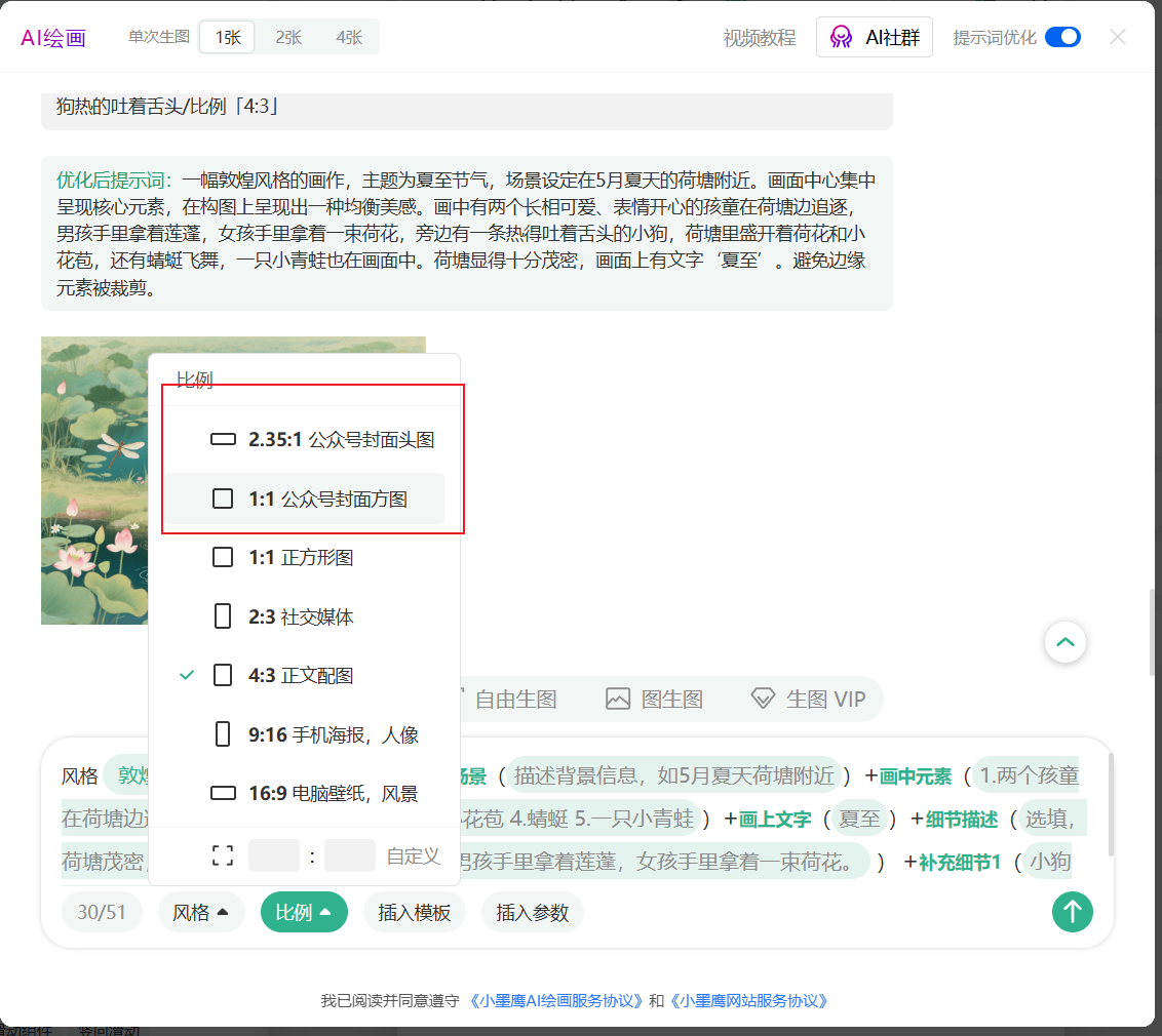 对于小白用户,不想写复杂的提示词,不想学习太多软件参数的直接用小墨鹰编辑器的AI绘画功能,内置专属的公众号封面图提示词,只需要简单改一下关键词就可以生成,三分钟学会。