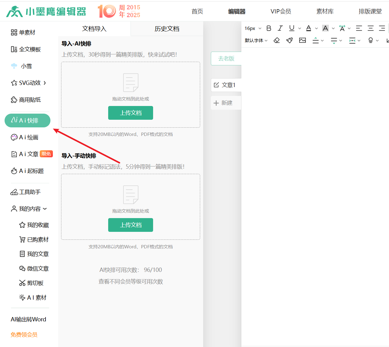 如果你从头开始写,点击“新建”即可;如果文章已经在Word中写好了,点击右侧的“导入”按钮,或左侧“AI快排”中的“导入-AI快排”,直接上传文档,无需手动复制粘贴。