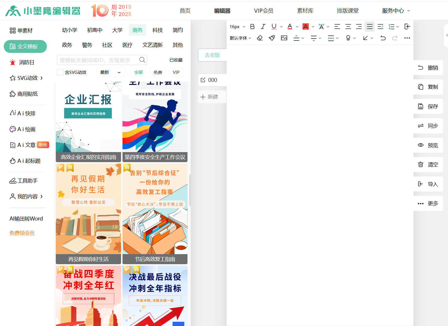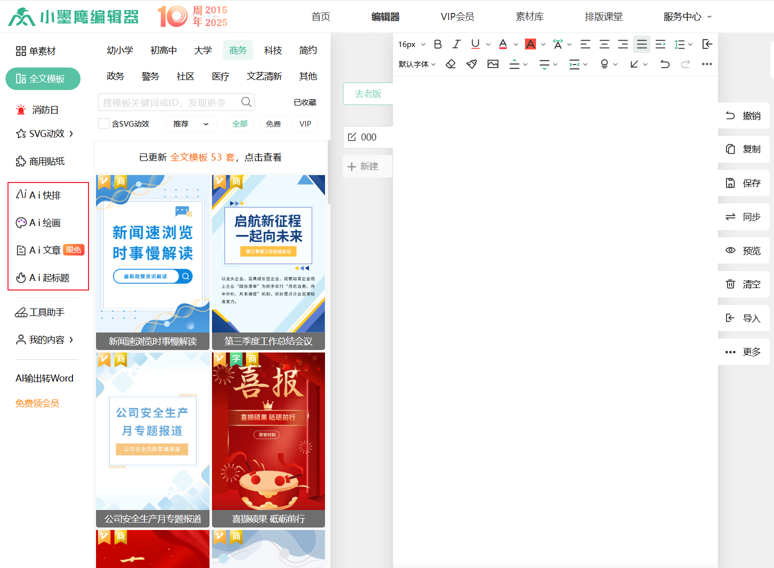 海量素材库:25万+单素材和1万+全文模板,覆盖45个行业