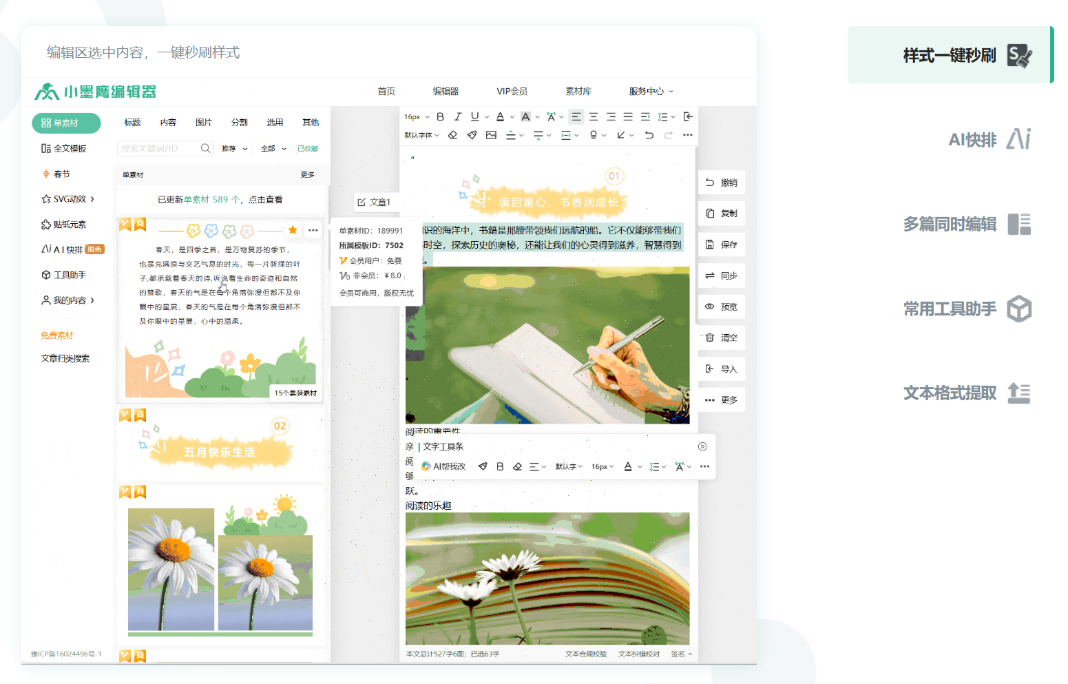 小墨鹰是我最近发现的一款宝藏工具,它彻底改变了我对公众号排版的认知。记得上周赶一篇紧急推文,用传统方法排版至少需要2小时,结果小墨鹰的AI快排功能30秒就搞定了,效果还出奇地好。