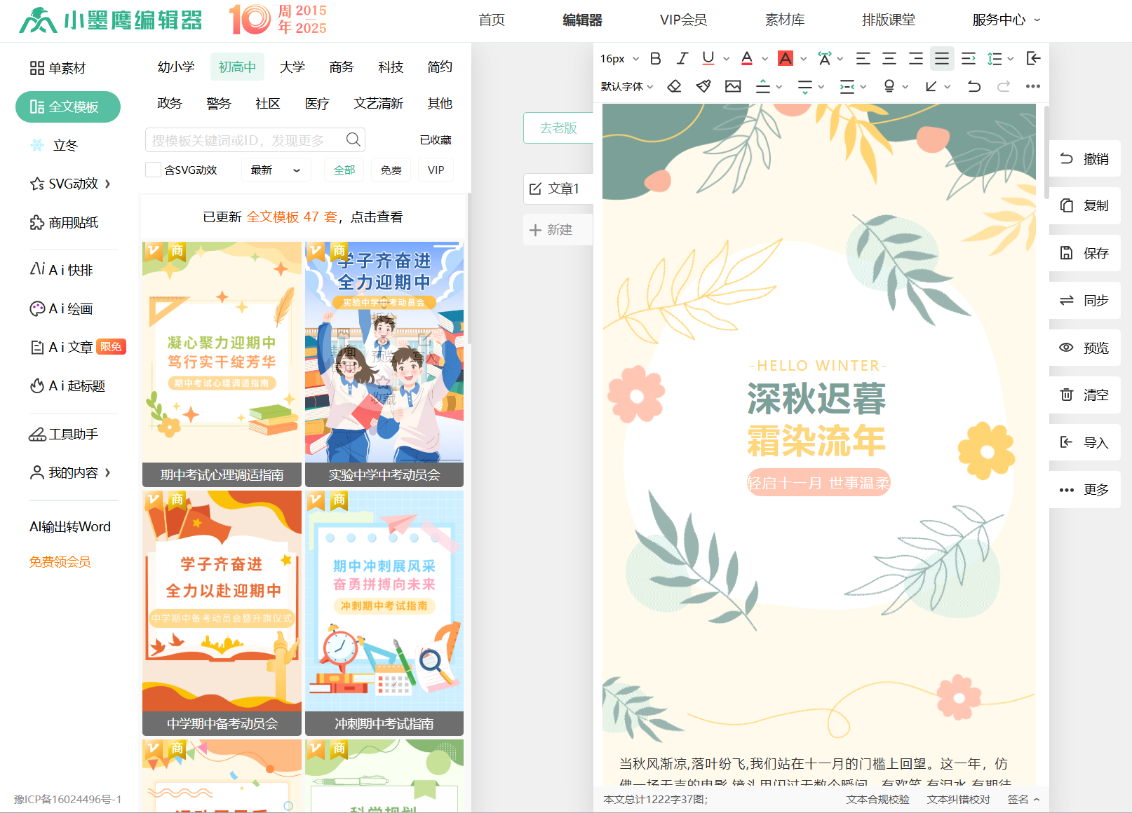 最后提醒,千万别陷入「找完美案例」的陷阱。有次我花了整天找商务类排版参考,后来发现用小墨鹰的「蓝色商务风」模板改个字就能用。工具的意义就是让我们把时间花在内容上,而不是反复调整行间距。