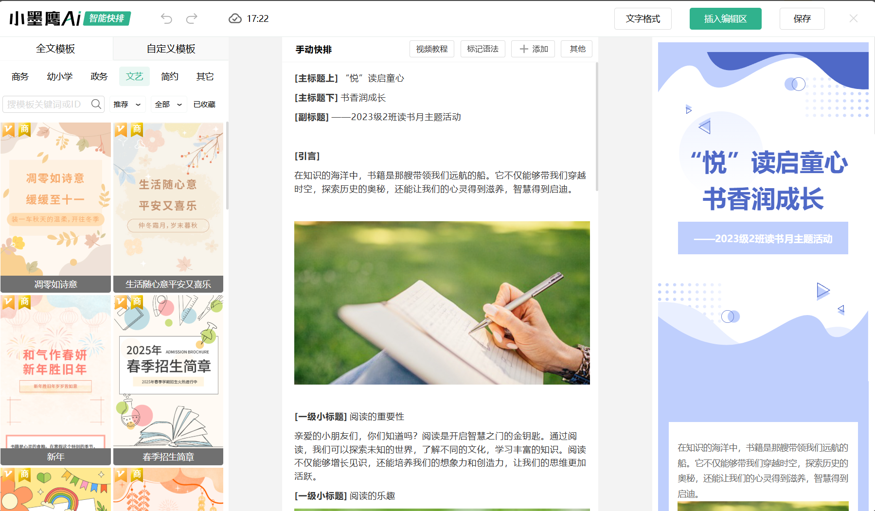 小墨鹰AI快排30秒内可完成一篇精美图文排版,如果网速快只需要十几二十秒就可以搞定。