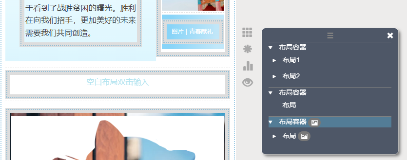 秀米的布局可以理解为一层层的容器,比如一个单列布局,你可以往里面放文字、图片、视频,整个布局可以被随意拖动,调整位置。