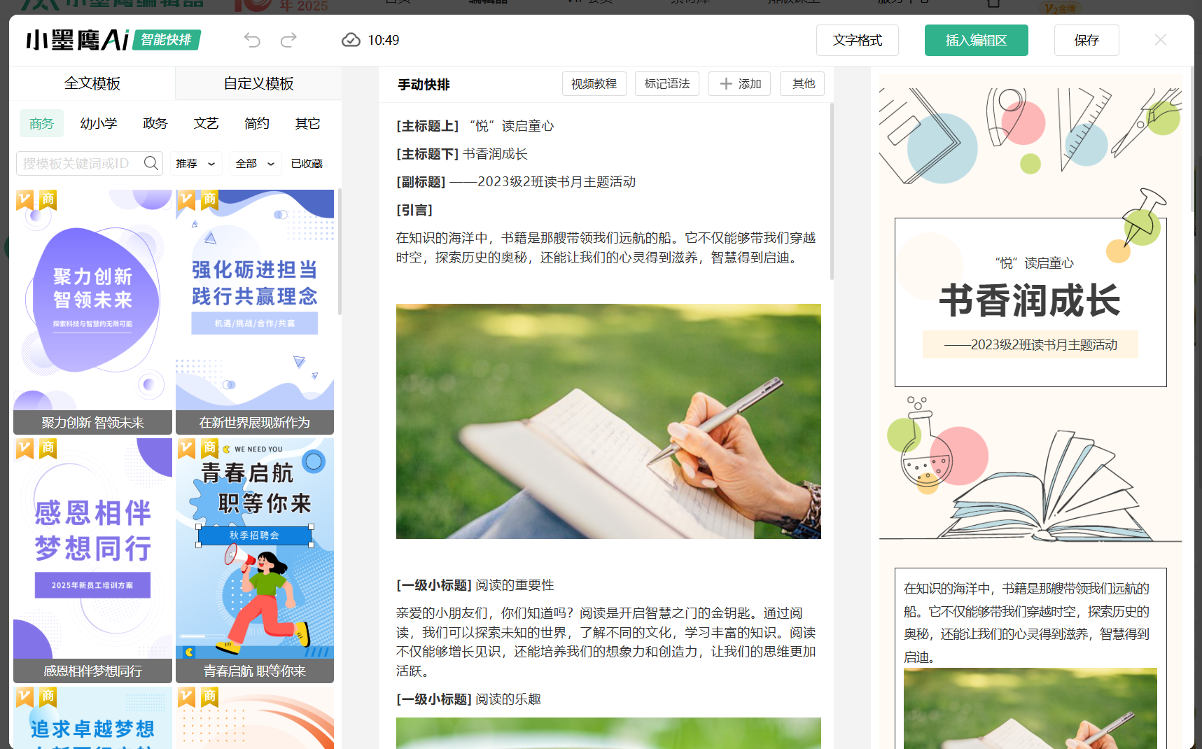 最近半年我几乎每天都在用小墨鹰,它彻底改变了我对排版工具的认知。最让我惊艳的是它的AI快排功能,30秒就能完成一篇文章的基础排版。上周我赶着发一篇活动推文,从Word导入到排版完成真的只用了半分钟,连领导都夸这次排版效率高。
