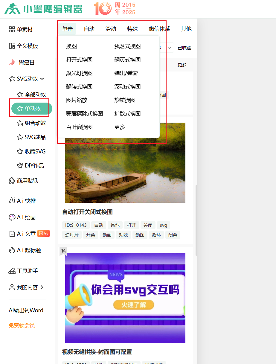 小墨鹰编辑器中有很多公众号文章排版使用的svg动画样式,如点击展开,点击换图,滑动换图,自动换图,点击题目出现答案,点击空白处出现答案等等,能大幅度提取微信公众号文章的趣味性和互动性。