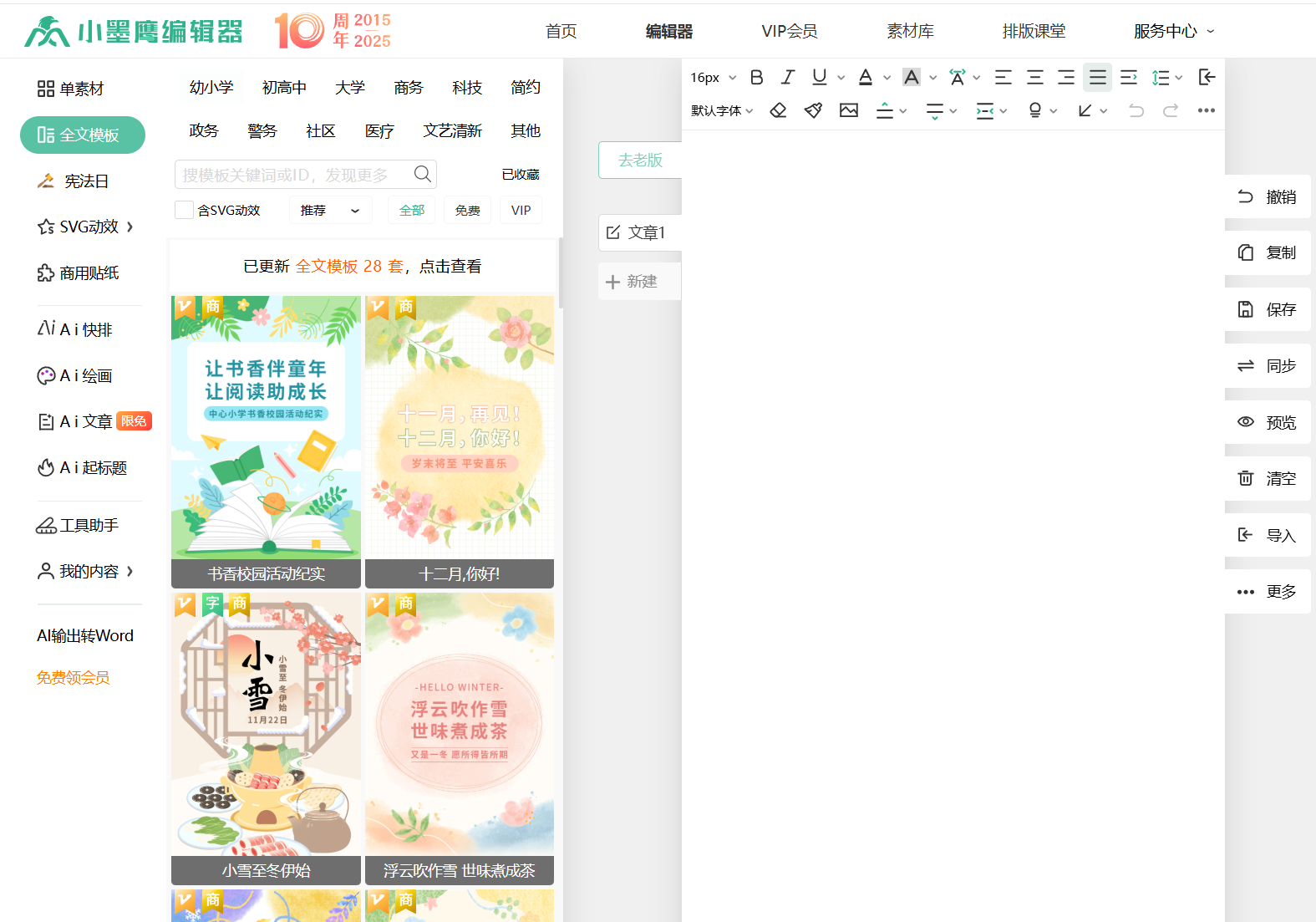 我是一个摸爬滚打已经三年的公众号小编,真心建议新手别死磕一个编辑器!刚开始我也觉得"一个工具走天下"挺酷,结果经常是某个活动主题缺少素材,或者好用的svg找不到。后来才发现,不同编辑器就像不同菜系的厨师——有的擅长快炒(效率型),有的专攻雕花(设计型),有的能做满汉全席(全能型)。今天就掏心窝子聊聊,为什么我电脑里常年躺着3个编辑器,以及新手该怎么组合使用它们。小墨鹰编辑器属于全能型的,我平时用的最多。
