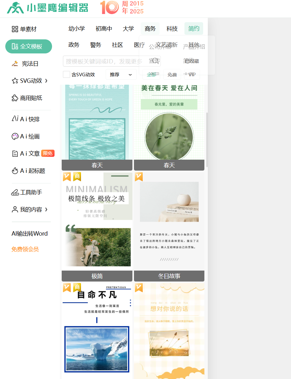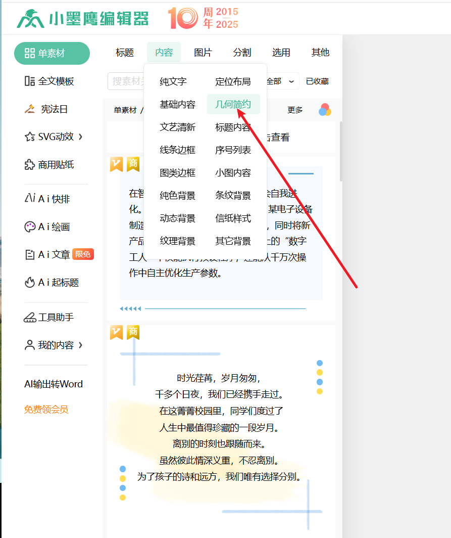新手做公众号,一开始不要最求太高的美观程度,可以先从简约风格开始,正常排版。一般用一些线条几何类型的素材模板,简约大气也好看,在小墨鹰编辑器里面找一下,很多。
