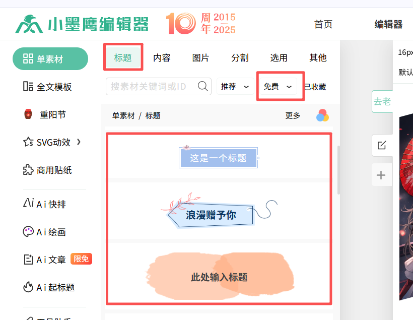 选择一个自己喜欢的标题样式,点击就可以写入编辑区;也可以先选中编辑区的标题文字,然后点击素材,直接套用样式,比较快。