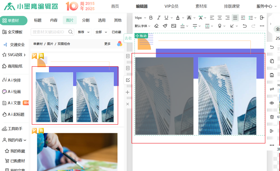 这时候就需要用到图片样式素材了点击网站左上角,鼠标移动到单素材→图片,这个分类上,在出现的分类中点击双图组合,这个类会有很多分类选项比如单图,双图,四图,左右文图,多图等根据你要排版的图片数量来选择