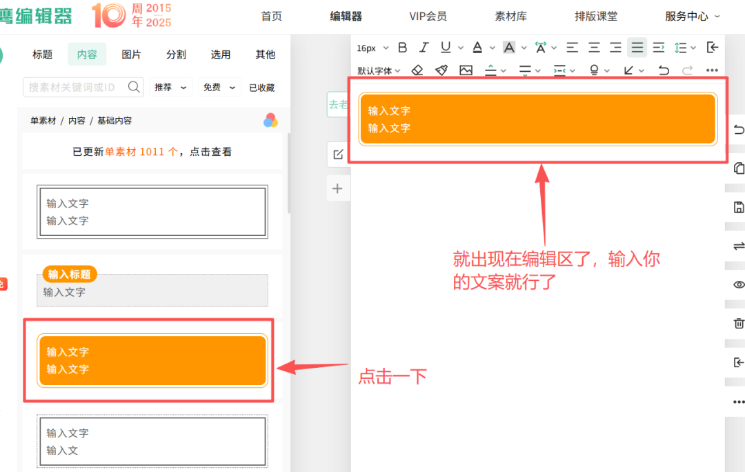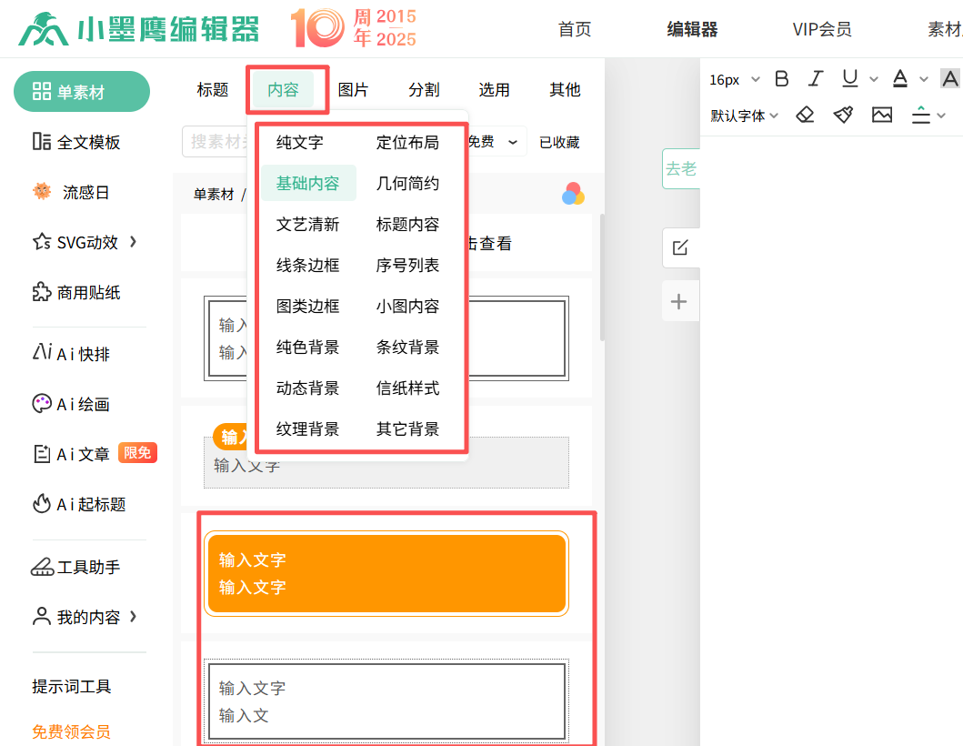 还是点击单素材的分类,这次选择【内容】分类,再选中基础内容