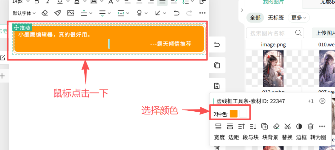 往下划鼠标,找到你喜欢的素材或样式,点一下,就放入了编辑区中啦