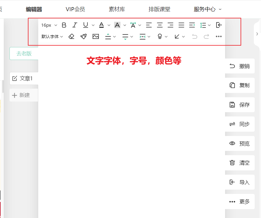 页面中间空白区域为编辑区,可以输入文字,编辑下图所示,编辑区顶部的位置,可以设置文字字号字体,调整间距,文字颜色等