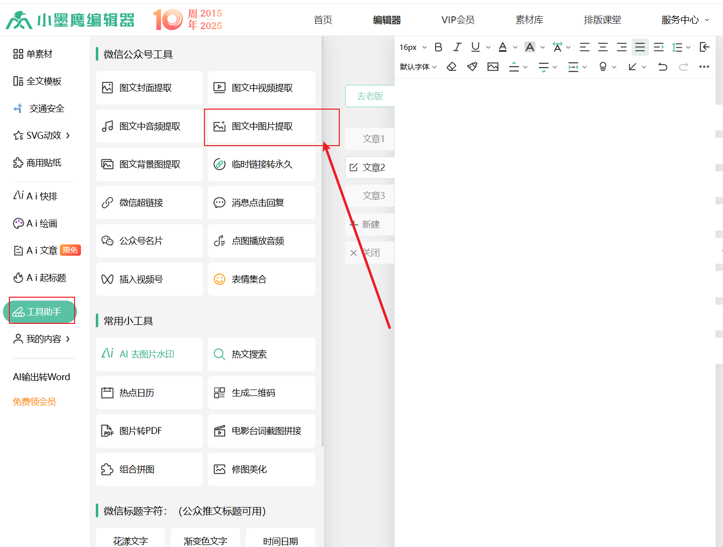 打开小墨鹰编辑器,点击左侧分类中的【工具助手】