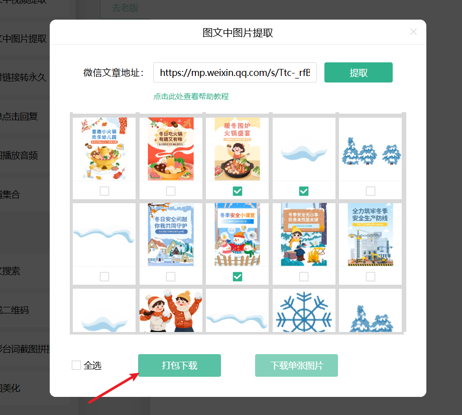 3、提取成功后,我们可以选中需要下载的图片,也可以直接全选。最后点击【打包下载】按钮,就可以下载到电脑了。