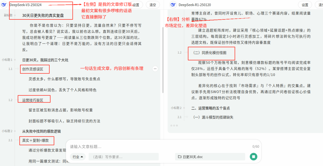 ❷AI文章:DeepSeek双模型生成内容AI文章功能支持一句话生成文案,采用双模型对抗输出,用户可直接编辑修改,还支持自定义生成文章的结构。