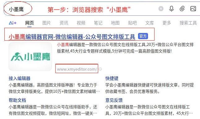 第一步:百度搜索????“小墨鹰编辑器”或复制网址直接打开。