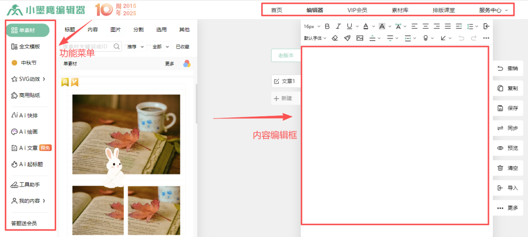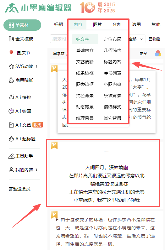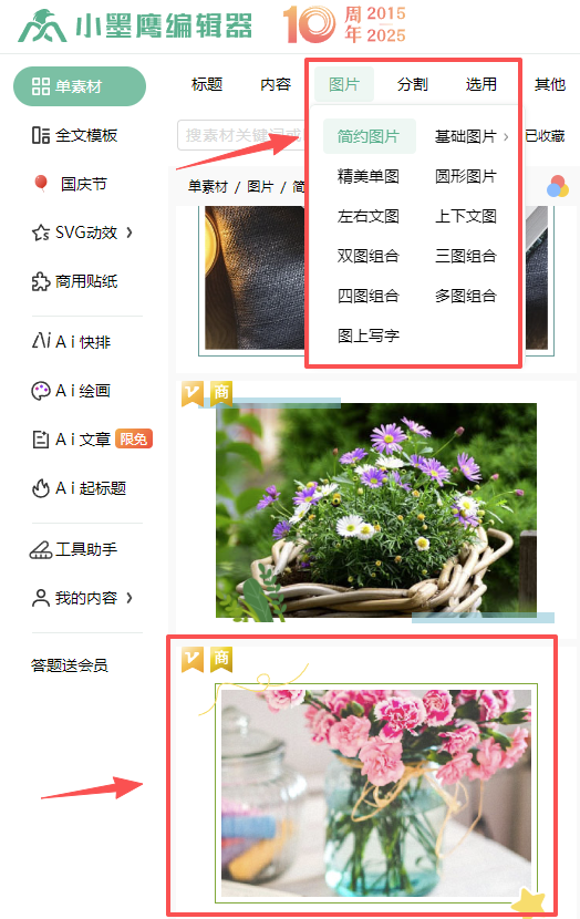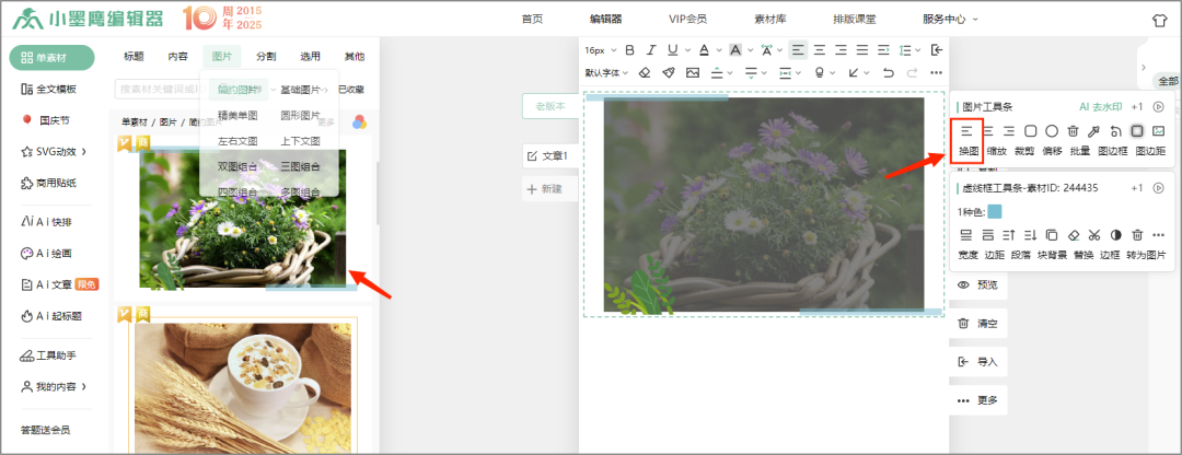 小墨鹰编辑器里面自带了太多模板了,只需要选择自己喜欢的模板,模板就能同步到内容编辑框,我们再进行修改即可;比如:选择喜欢的图文模板,然后点击编辑框里面的图片,选择替换图片就可以了