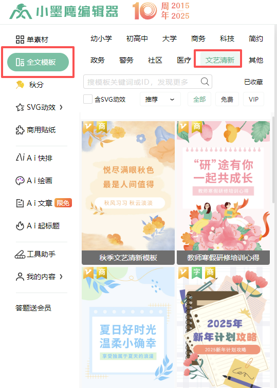 6、全文模板如果你不想一个模板一个模板的选择与编辑,还可以直接使用全文模板。一键排版,效率超级高;而且里面的模板种类很多,结合行业和账号定位筛选即可;