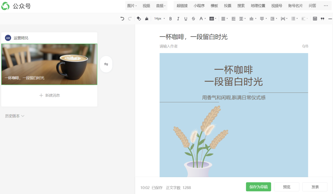 8、登录微信公众号后台,选择文章编辑,进入内容编辑框,粘贴复制的内容设置好内容标题、封面图片、确认无误保存预览,就能群发给公众号粉丝了;