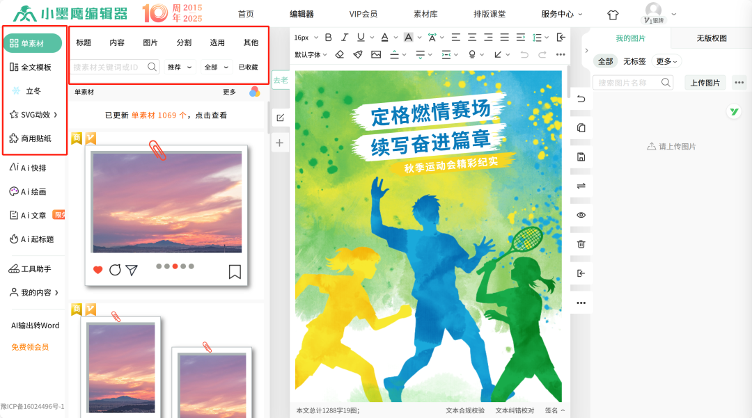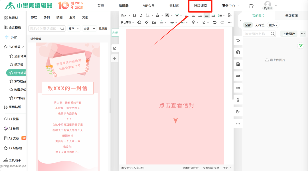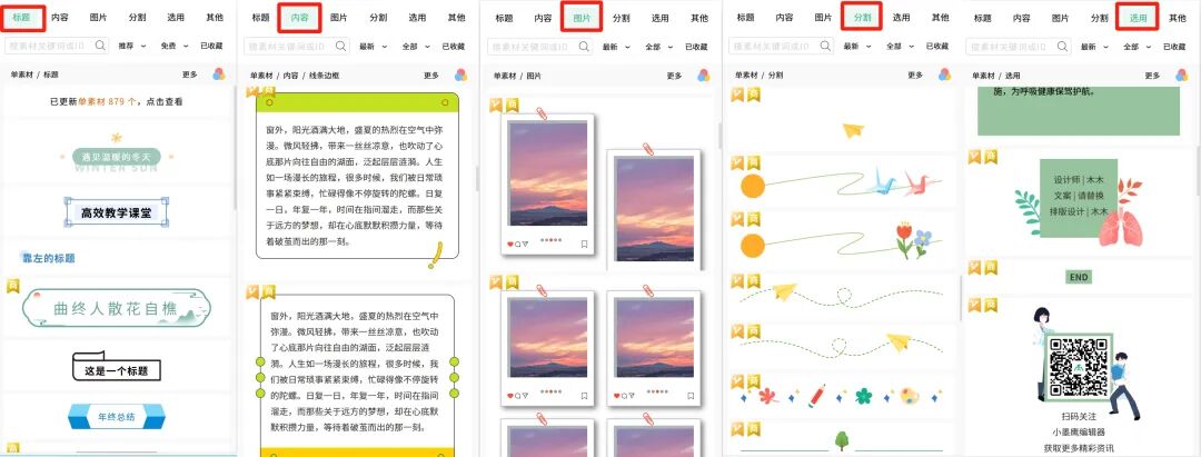 位于中间部分,这里提供了丰富的排版素材和资源。你可以根据需要快速选择模板、图标、图片等素材,直接拖拽或点击即可应用到文章中,大大提升排版效率。
