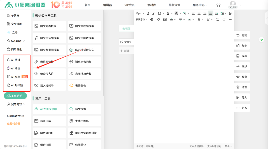 在右侧的文章编辑区,你可以调整文本的格式,比如字体、字号、首行缩进、对齐格式、如何插入图片等等。右侧的小工具栏中,你可以复制文章,或者保存文章、预览文章,每个用户都可以实现同时编辑多篇文章~