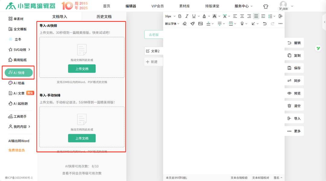 如果赶时间,来不及手动排版,可以将文章一键导入编辑器,实现AI快排~在左侧功能选择区点击“AI快排”-“上传文档”,将本地文章上传到编辑器中,等待几十秒。
