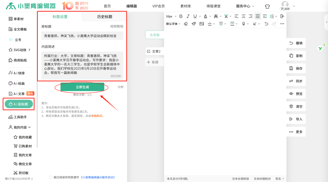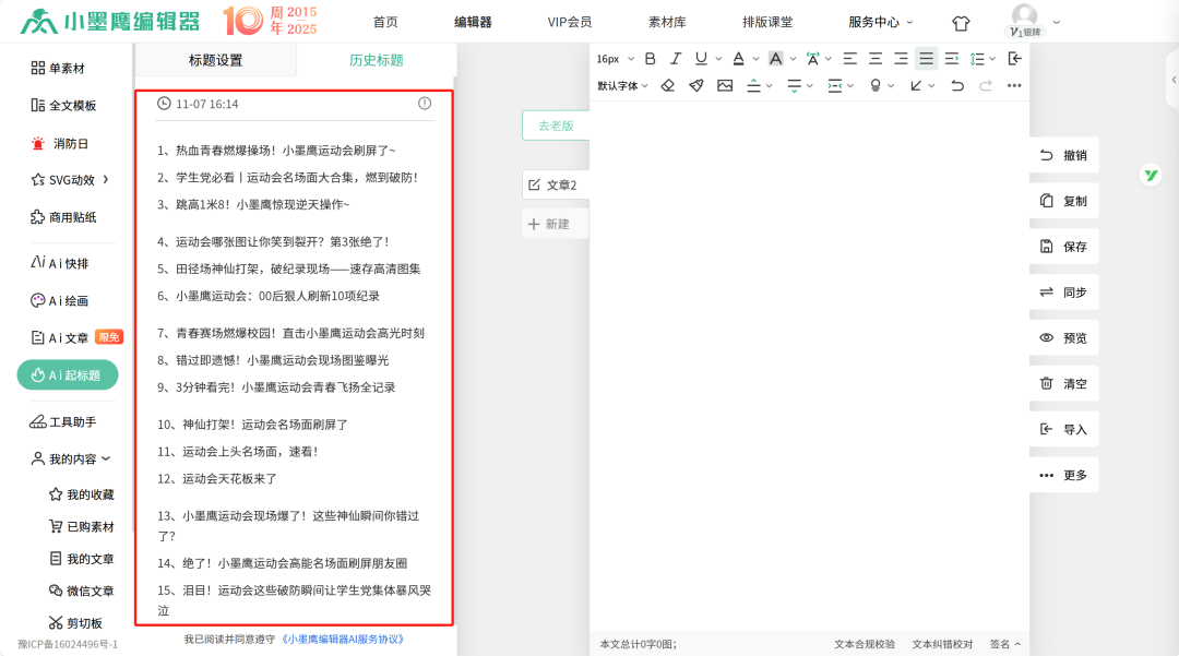 1分钟生成15个标题,瞬间感觉自己起的标题——《青春激昂,神采飞扬|小墨鹰大学召开春季运动会》LOW爆了!!!