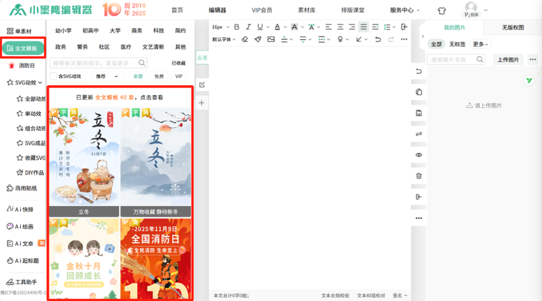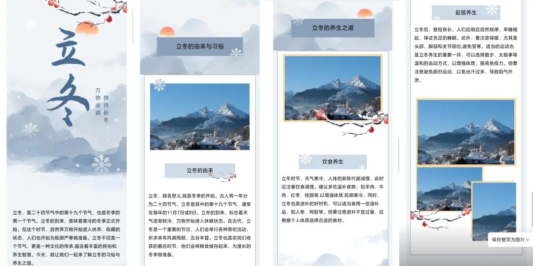 而且小墨鹰还配备了许多排版模板,在左侧功能区点击“全文模板”,就能一键给文章“换衣”,前几天刚好立冬,就以立冬和大学运动会为例给大家给大家展示一下排版效果~