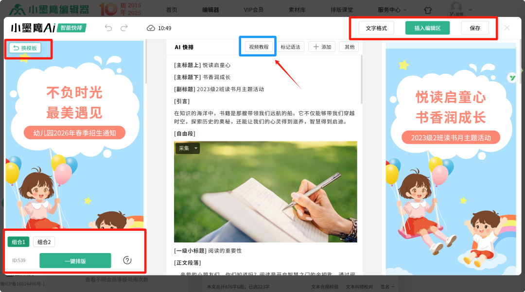 如果对生成好的文章排版不满意,可以在生成好的界面中根据自己的喜好换模板、还可以进行不同样式的组合,对文字格式进行调整、点击右上角“保存”,即可将文章保存至编辑器当中。