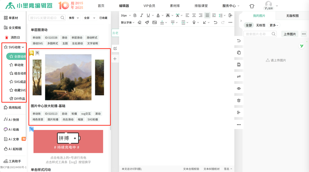 单击左侧的“SVG动效”,在素材选择区选择一个喜欢的素材,插入文章当中,这样,一个动画就添加好了。