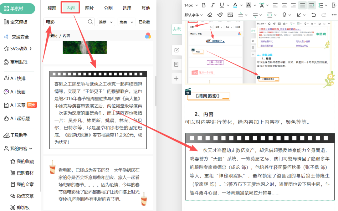 可以选择各种风格的标题,比如,我要找一个电影类型的标题,直接在在搜索框搜索电影。
