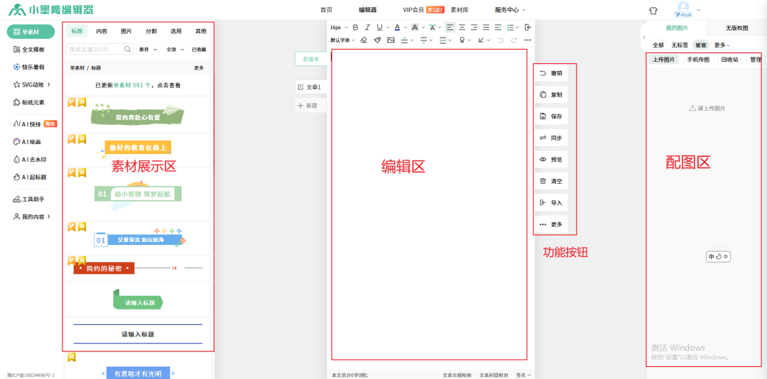 编辑区:图文编辑区是主要的操作区域,结合顶部的工具栏和点击素材弹出的菜单,对文字和图片进行快速编辑排版。