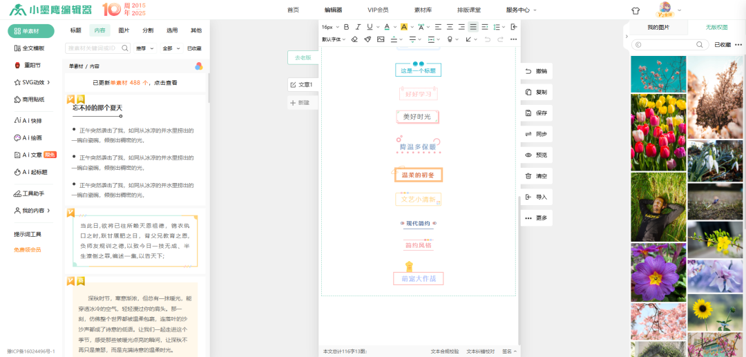 核心功能:以海量“节日营销”素材和“主题模板”为核心,提供素材采集与一键套用功能,致力于实现模板化的快速内容排版与发