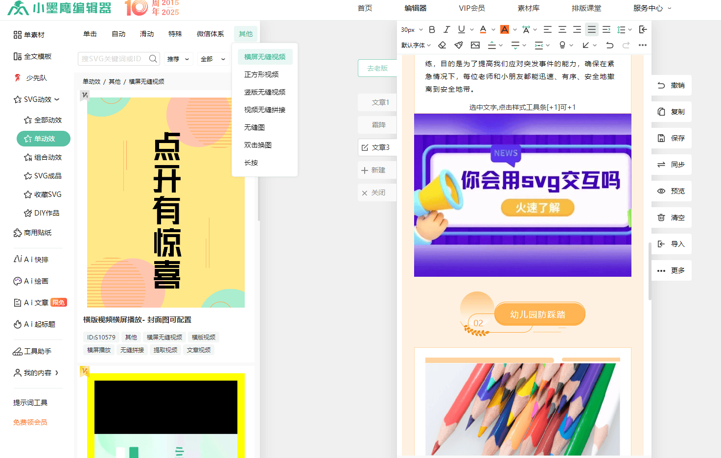 这时候就要祭出我的第二个法宝——小墨鹰编辑器SVG动效里的视频素材!在编辑器左侧点击“SVG动效”,找到“单动效”分类里的“其他”子分类,这里面藏着超级多炫酷的视频动效素材。有科技感的数字倒计时、唯美的花瓣飘落、动感的线条穿梭等等,每个都能直接用在视频里。