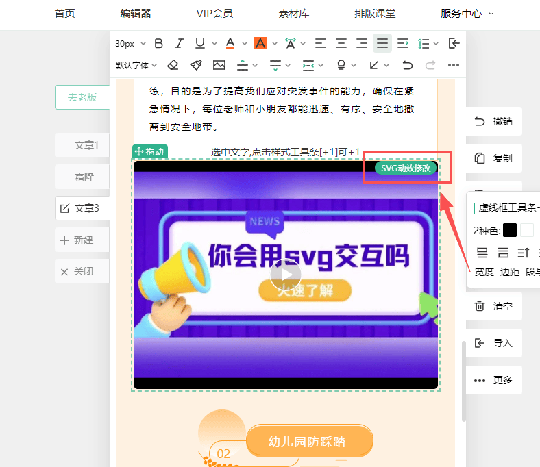 使用方法更是简单到没朋友:选好喜欢的动效,点击写入编辑区,然后点击右上角的“SVG修改”,就能自定义内容了。比如那个数字倒计时动效,我可以把里面的数字改成我的视频标题;那个花瓣飘落的动效,我可以调整花瓣颜色来匹配视频主题。