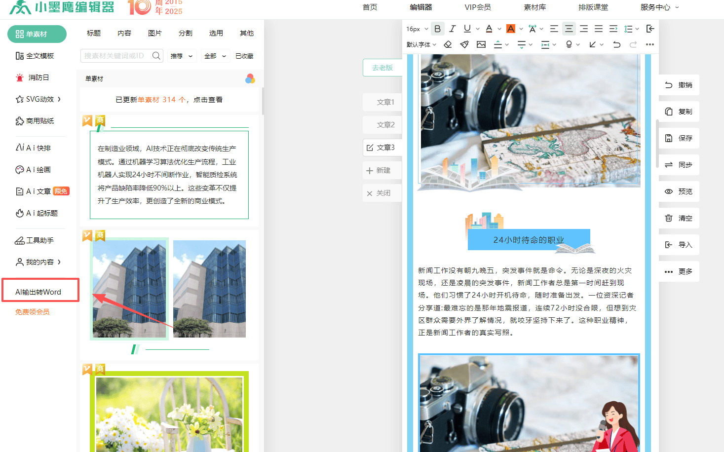 就在我对着满屏的星号和代码块发愁时,偶然在小墨鹰编辑器左侧发现了一个叫“AI输出转Word”的功能。点开之后,AI编辑器的界面简单得让人放心:左边一个大输入框,右边一个预览区。我把那段乱七八糟的AI文案复制到左边,几乎就在松手的瞬间,右边就出现了干干净净的纯文本。