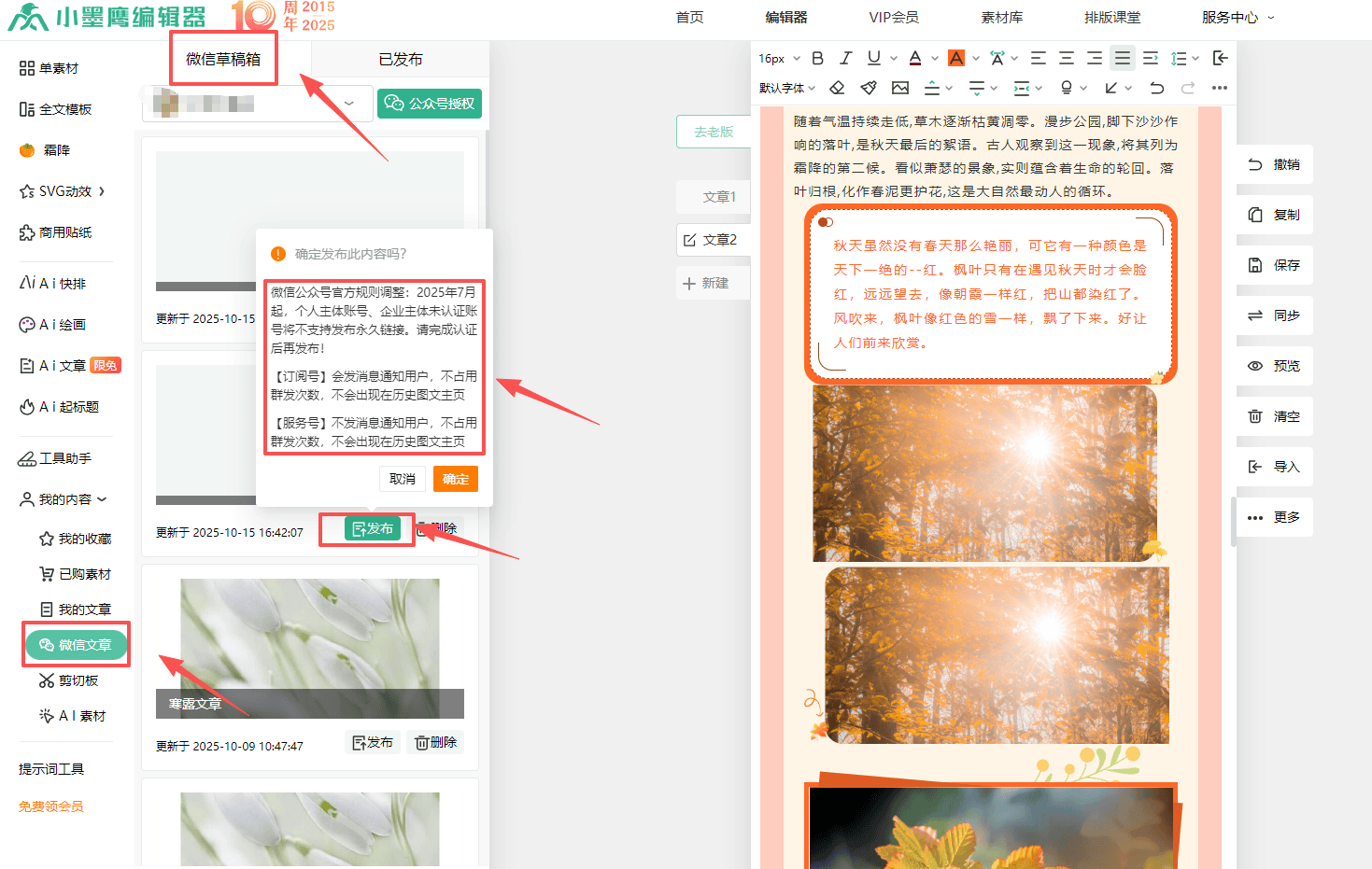 再说说发布功能。先把文章同步到公众号草稿箱,然后回到小墨鹰编辑器点击“发布”。这里要特别提醒大家:2025年7月起,个人账号和没认证的企业账号就不能发布永久链接了。所以如果想长期使用这个功能,最好早点完成认证。