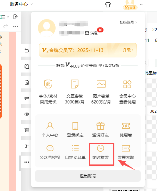 先说群发吧。点击小墨鹰编辑器右上角头像,使用定时群发功能。你可以选择立即群发,也可以定时群发。比如我经常在晚上准备好第二天的推文,设定早上9点自动群发。这样文章会准时推送给所有粉丝,还会出现在公众号主页,粉丝也会收到通知。不过要记住,订阅号一天只能群发一次,可得珍惜这个机会!