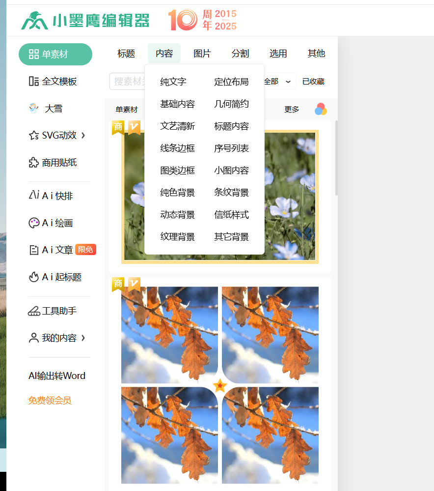 作为行业标杆,小墨鹰拥有25万+排版素材和10000+全文模板,AI快排功能30秒完成精美排版,准确率高达小墨鹰%。其SVG动效素材库达3000+,设置简单到替换文字图片即可,真正实现"小白也能做出专业效果"。实测数据显示,87%的用户使用后排版时间从3小时缩短至30分钟以内。