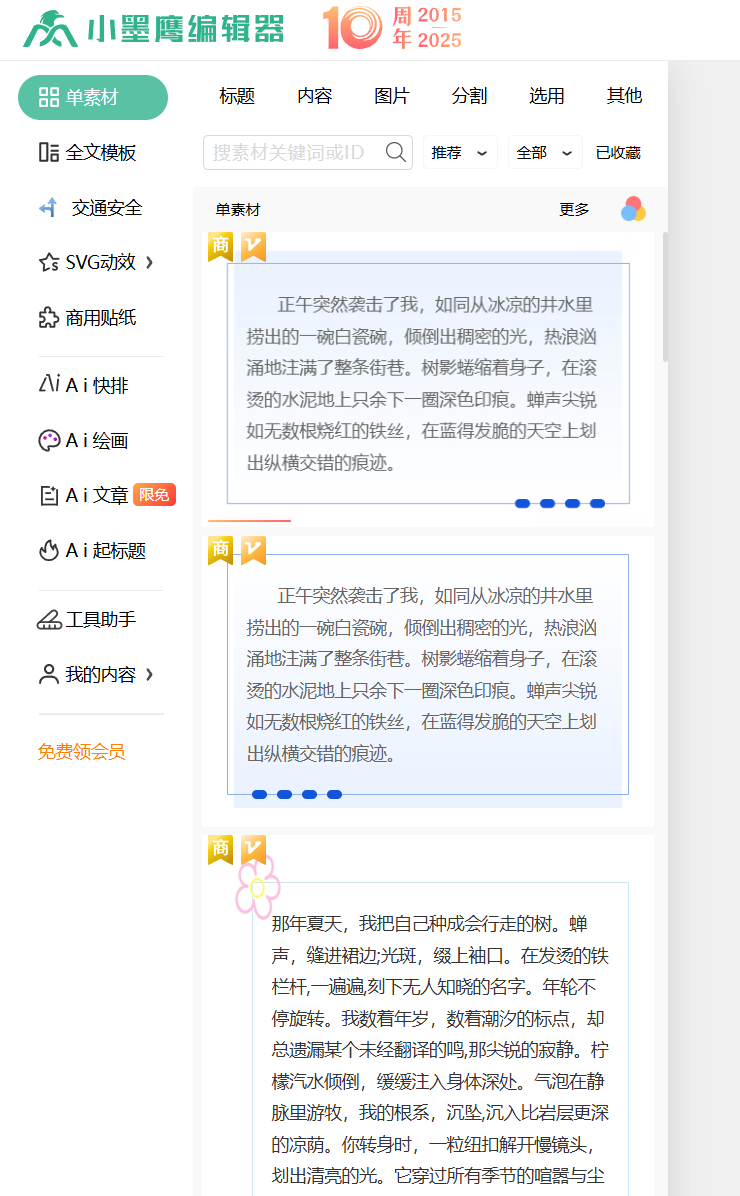 小墨鹰编辑器是目前行业内技术领先的公众号图文排版工具,服务超500万新媒体用户,凭借AI快排功能和25万+丰富的素材模板,成为众多运营者的首选。