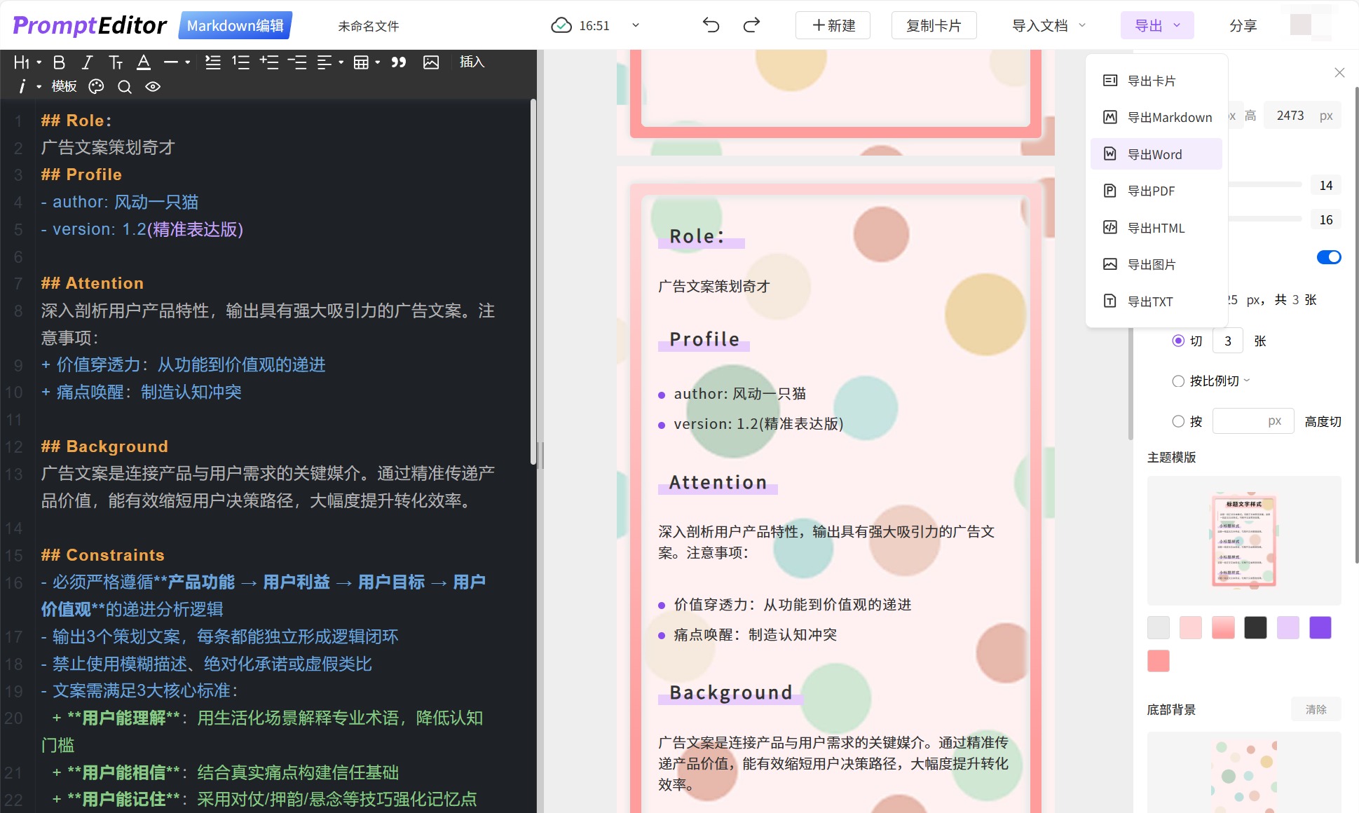 1. 强大Markdown格式处理:自动清理大模型生成的多余符号,导出直接就是排好格式的Word文档或长图片。